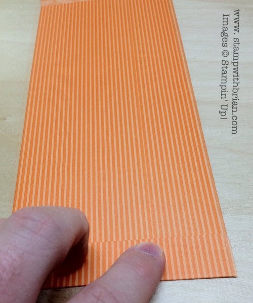- I cut a piece of Pumpkin Pie Designer Series Paper Stack paper to 9-1/4″x11-3/4″. I chose this DSP with stripes as the exterior of the envelope. I wanted the lines to extend the length of the envelope, so I ensured the lines were horizontal on the 11-3/4″ side.
