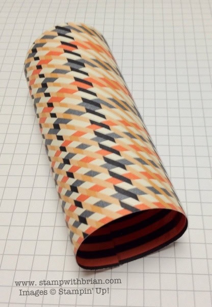 1. Trim a piece of Designer Series Paper to 4-1/4″ x 5-1/2″ (I tried it with a piece of embossed card stock, too, but I think the thinner paper works best). I rolled the paper into a tube before getting started – just a per-performance warmup for our little piece of DSP.