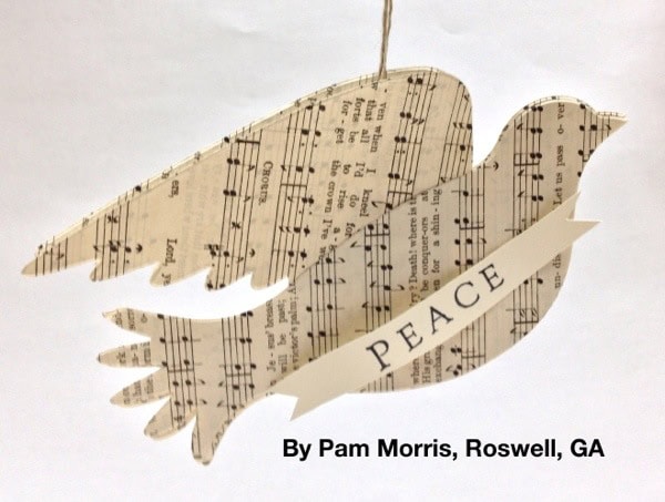 Oh yes this is a stunner…I have this die but haven`t used it yet…how creative to do it in music pages!!!! As I have said before I like music stamped or prints on cards…. I`m also loving the white on white (or vanilla) and currently have a ton of various embossed pieces of white CS to use on cards that I want to do after Xmas…. how creative you are Pam ….to then turn your dove into an ornament ….so very clever you are !!!!