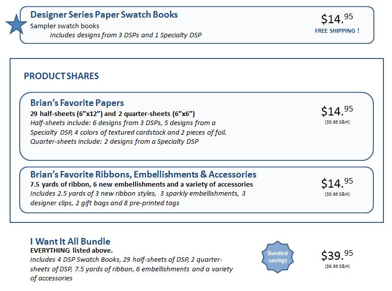 Before the online release of the Holiday Catalog, I cannot give proper names of the items or item numbers, but I think my descriptions share enough for you to figure out what I’m talking about. 🙂 If you would like to sign up for a seat in one (or more of these shares), please complete the form below and submit it to me. I will order the products, bundle them up, carefully package them and mail them back out as soon as the shares fill. Please contact me at stampwithbrian@gmail.com if you have any questions.