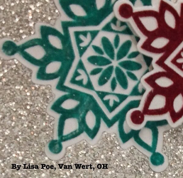 - Not wasting a bit. This isn’t technically an element of the card I love, but it’s certainly worth mentioning here. As I studied Lisa’s card, I noticed that the two background snowflakes are embedded in the glimmer paper. That means my supply-saving friend has two glimmer snowflakes that are likely included in some other gorgeous card. Yipee for not wasting!