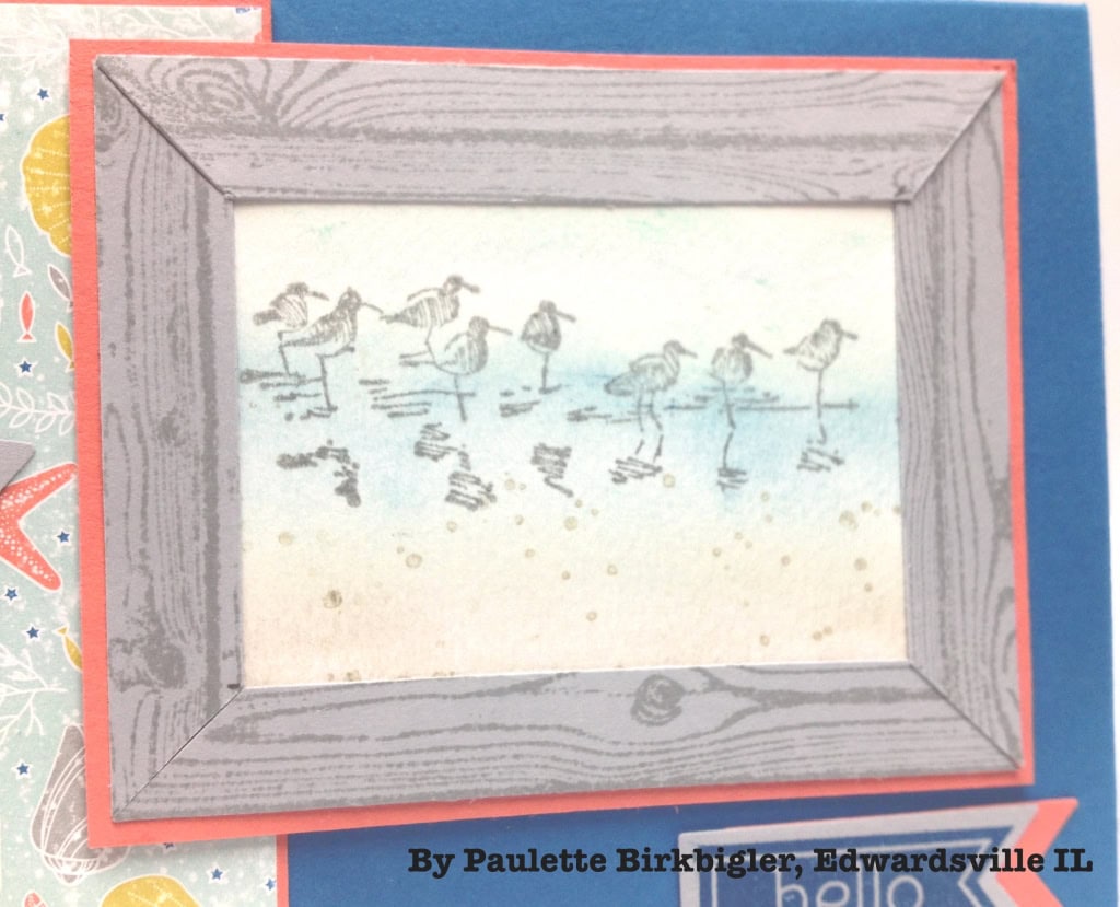 What a great idea, using the Hardwood stamp to make a frame for the sandpipers. There will be a lot of framing out in stamp land today! Thanks, Paulette, its a lovely card!