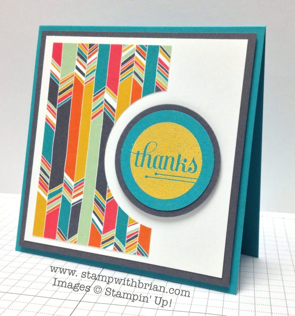 18. Modern indeed, and I absolutely love it! The colors in the DSP remind me of the beautiful blankets made by our Native Americans. I have often used the half circle negative on cards also. It’s a great visual. My DSP swatches arrived Friday. They’re the best things to use for reference. Thank You Brian.