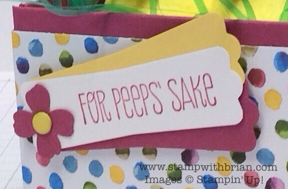 • The cute banner on the front is stamped with a sentiment from For Peeps’ Sake and consists of three punches from the Modern Label punch – glued together in a fanned look.  I adorned the flagged label with a punched flower from Itty Bitty Accents punch and a Candy Dot.For Peeps' Sake, Stampin' Up!, Brian King