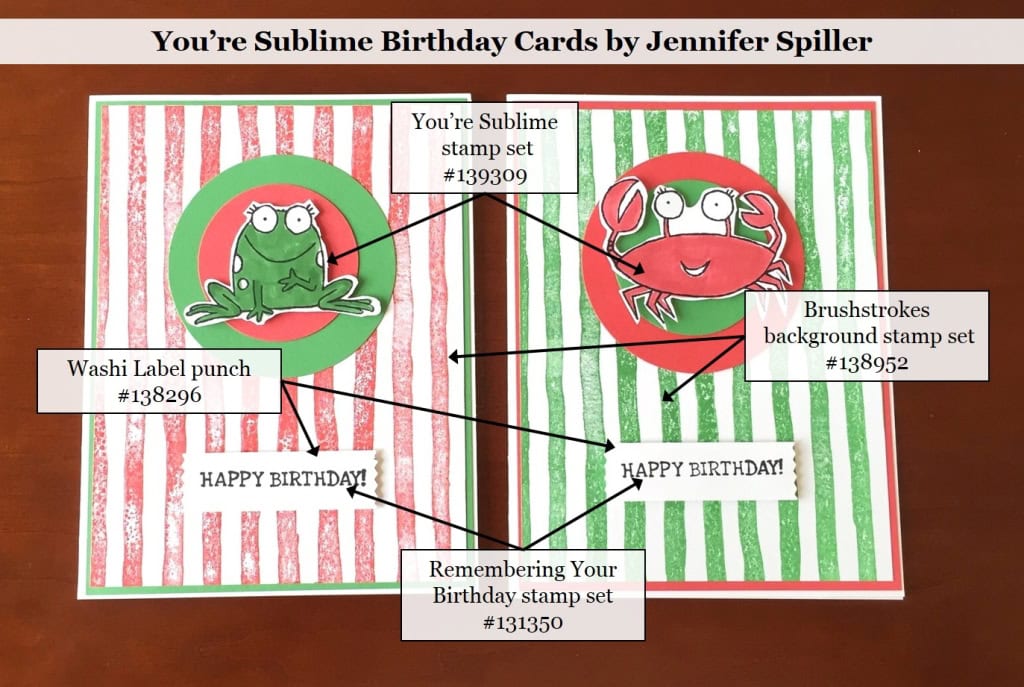 Stamp Sets: You’re Sublime, Bushstrokes, Remembering Your Birthday Papers: Thick Whisper White, Whisper White, Watermelon Wonder, Cucumber Crush Inks: Watermelon Wonder, Cucumber Crush, Archival Basic Black, Stampin’ Write Markers (Watermelon Wonder, Cucumber Crush) Accessories: 1-3/4″ Circle punch, 2-1/2″ Circle punch, Stampin’ Dimensionals