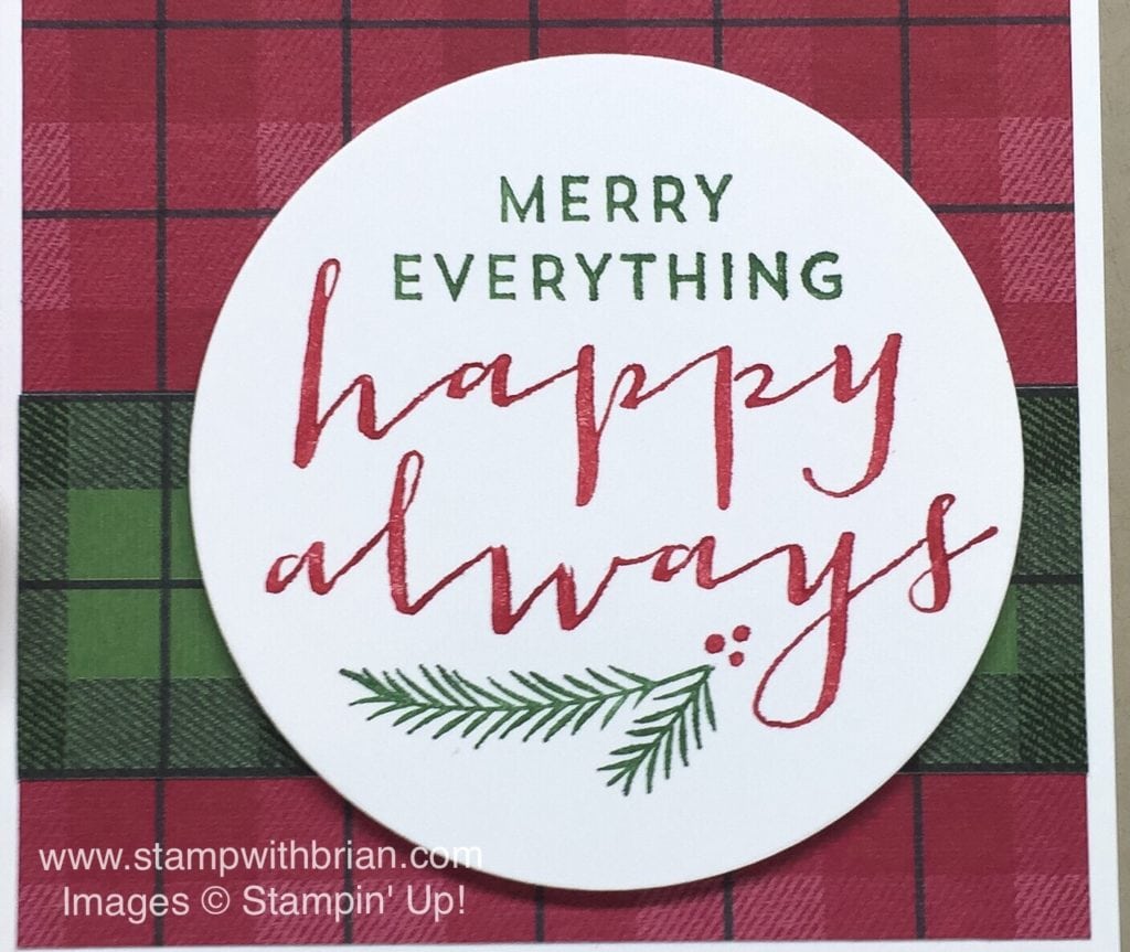 GOOD NEWS! There are several sets of Stampin’ Write Markers offered as pairs in the Holiday Catalog – I used the pair of Cherry Cobbler and Garden Green to create this card. - Warmth & Cheer. The backdrop for this sentiment is a gorgeous plaid from Warmth & Cheer Designer Series Paper Stack. This plaid is offered in two colors in this pack of papers – Cherry Cobbler and Garden Green – same pattern, different colors. I created a band of green and lined it up exactly over the red plaid to create my band. It creates a nice visual – one pattern with two colors.