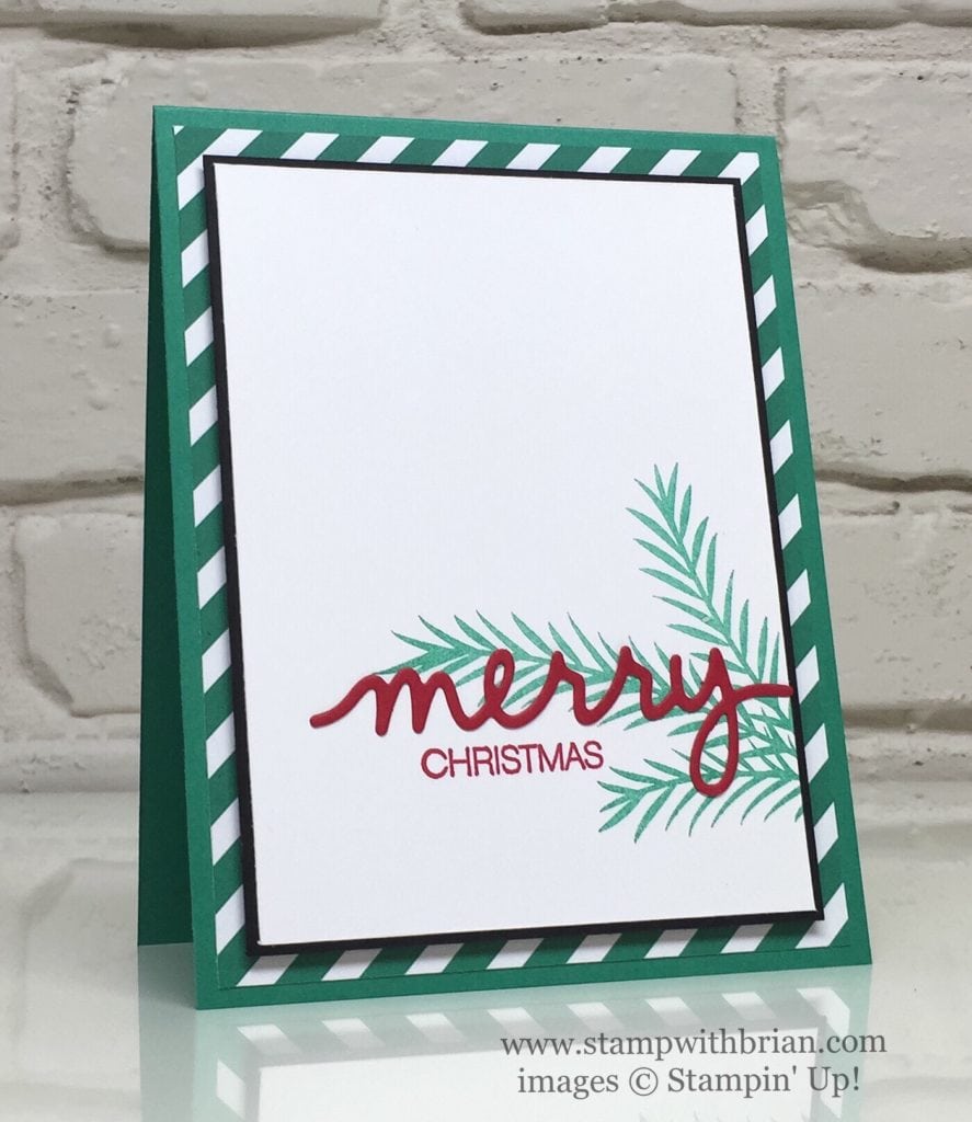 I adore a clean card with lots of white space – white space can be a very important element on a card.  For this week’s CAS(E) This Sketch Challenge, I made a quick and sweet Christmas card with a tree bought and a simple sentiment.  I layered bold stripes behind the clean image to add a little extra intrigue to this clean card.  You know I can’t help myself, right?  Here’s my card: