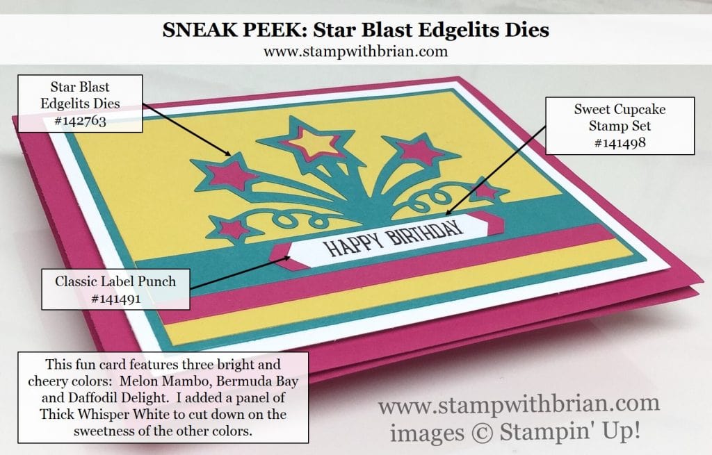 Wow, it seems the birthday projects have been non-stop. While I’m excited to share today’s project, I promise I’ll make an effort to go non-birthday tomorrow. 🙂 Today’s card showcases the amazing Star Blast Edgelits Dies that create a super-fun burst of stars and excitement. I accented this fun die with three bright, beautiful colors that are perfect for a birthday celebration: Melon Mambo, Bermuda Bay and Daffodil Delight. I think you’ll agree this is a cheery card. Here it is: