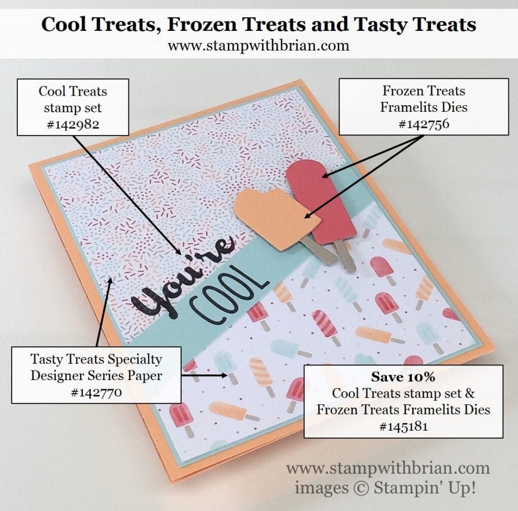 Stamp Sets: Cool Treats Papers: Tasty Treats Specialty Designer Series Paper, Peekaboo Peach, Pool Party, Watermelon Wonder, Crumb Cake Inks: Archival Basic Black Accessories: Frozen Treats Framelits Dies, Stampin’ Dimensionals