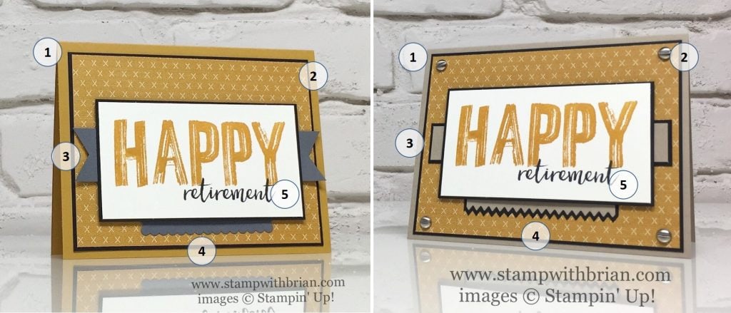 I liked the first version, but there was something really special about the updated, new version of the card. I saved the sentiment – I cropped the sentiment panel off the first card (snip the Stampin’ Dimensionals with Paper Snips and roll the adhesive off the back of the panels) and recreated the other panels. Can you spot the five things that are different between the two?