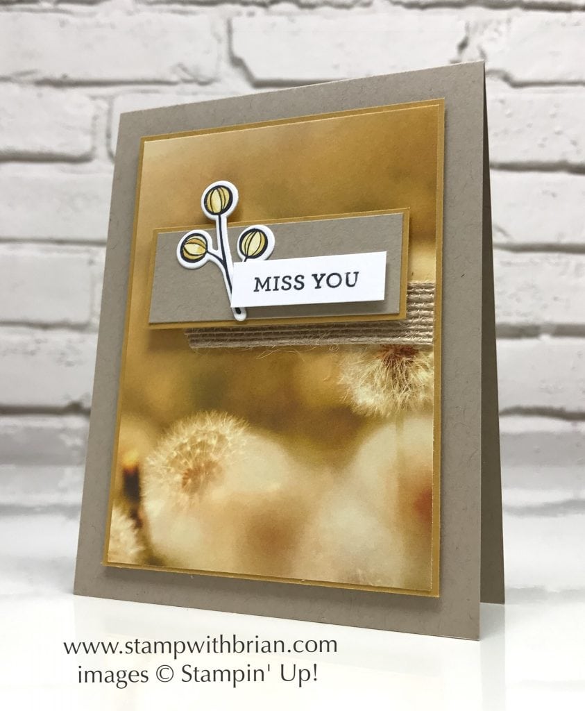 • Delightful Dijon.  Oh, how I’ll miss Delightful Dijon!  Not only is this rich shade of yellow featured in the background paper, but I’ve pulled it out in the thin borders around the layers and in the sweet stem from Falling Flowers – it’s not a dandelion, but it has the same shape and coordinates perfectly here, don’t you think?  I colored the buds on this stem with a Blender Pen for a light hint of Delightful Dijon.