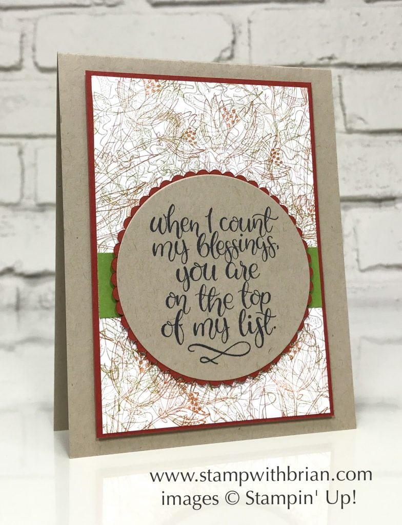 - Count My Blessings.ย The Count My Blessings stamp set, new in the 2017 Holiday Catalog, was not at the tippy top of my wish list from this catalog.ย I loved the sentiments from the very beginning, but I didn’t feel inspired by the images.ย Then I started seeing some amazing projects in my team’s Facebook group – and that inspired me to push the set higher on my list.ย Thanks, Royals!ย Here’s a peak at Count My Blessings: