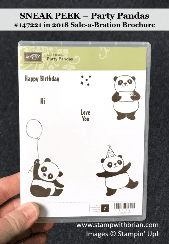 • Party Pandas. How adorable is this sweet panda bear holding a love note just for you? There are two more pandas in the new stamp set – and it’s not for sale.Β  How can you get one of your own? Between January and March, Stampin’ Up! hosts an annual sales event called Sale-a-Bration. For every $50 spent on an order during Sale-a-Bration, you can choose a free item from a brochure of exclusive items.Β  Party Pandas is one of those items – here’s a look at this fun set:Β  Party Pandas, Stampin' Up!, Brian KingHow will you showcase these pandas?Β  Valentine’s Day, birthdays, congratulatory celebrations. Which occasion is most appropriate for sweet, black-and-white bears? I mean, really – how adorable is this sweet bear – he’s so proud of the card he’s made?Party Pandas, Stampin' Up!, Brian King