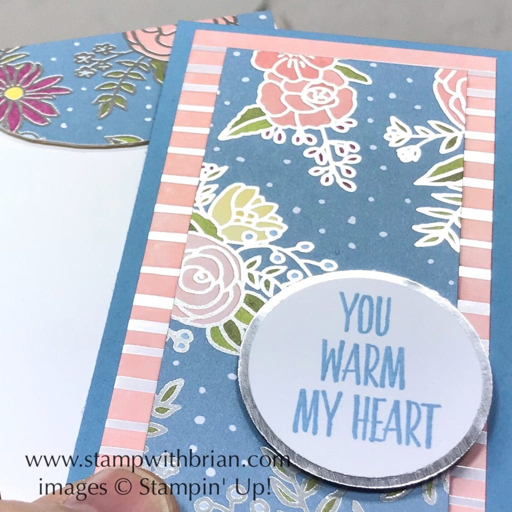 - The Envelope. The envelope for this narrow note card is pulled from the Whisper White Narrow Note Cards & Envelopes – you HAVE to have these! On several occasions, I’ve glued a piece of Designer Series Paper (cropped with a 2-1/2″ Circle punch) on the inside of the envelope. Since I was working with a thick Specialty Designer Series Paper on this project, though, I covered the back flap of the envelope and trimmed around the edges of the flap. Look at all of the shine on this card and envelope flap: