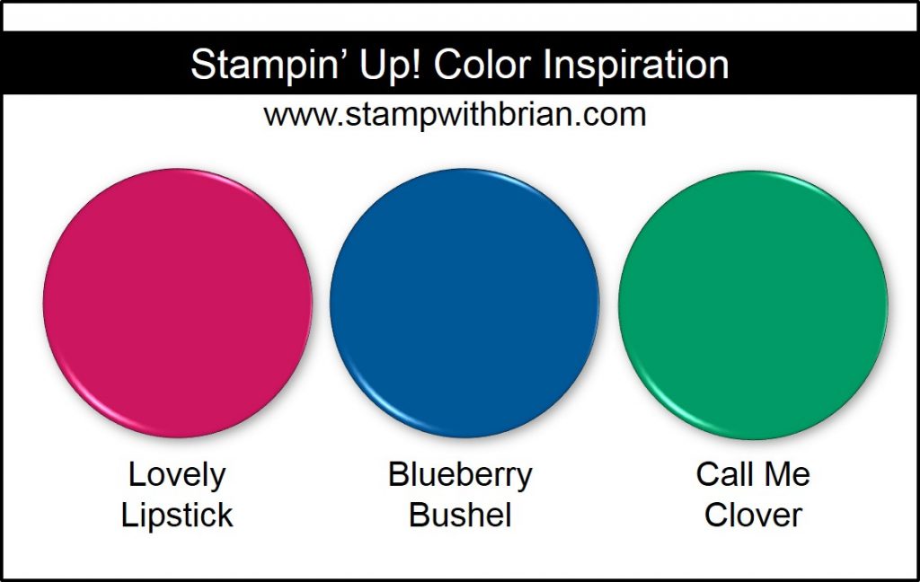 • Bright and Bold. My card features four of the 2018-2020 In Colors – all except Grapefruit Grove. Here’s a look at all five of the 2018-2020 In Colors: Stampin' Up!'s 2018-2020 In ColorsTo learn more about these new colors (along with color comparisons and suggested color combinations), please click here. While Pineapple Punch plays an important role on this card, it’s Lovely Lipstick, Blueberry Bushel and Call Me Clover that really set the mood. If you are inspired by this color combination, please save this:Stampin' Up! Color Inspiration: Lovely Lipstick, Blueberry Bushel, Call Me Clover