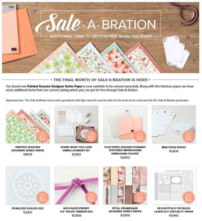 While you can certainly still purchase Petal Promenade Designer Series Paper (I’m not going to stop you), you can also earn it as a Sale-a-Bration reward through March 31. If you redeem it as a Sale-a-Bration reward, use code 152839. Here’s a flyer that shows all the new Sale-a-Bration items that were added to the “with a $50 purchase” category on March 1: