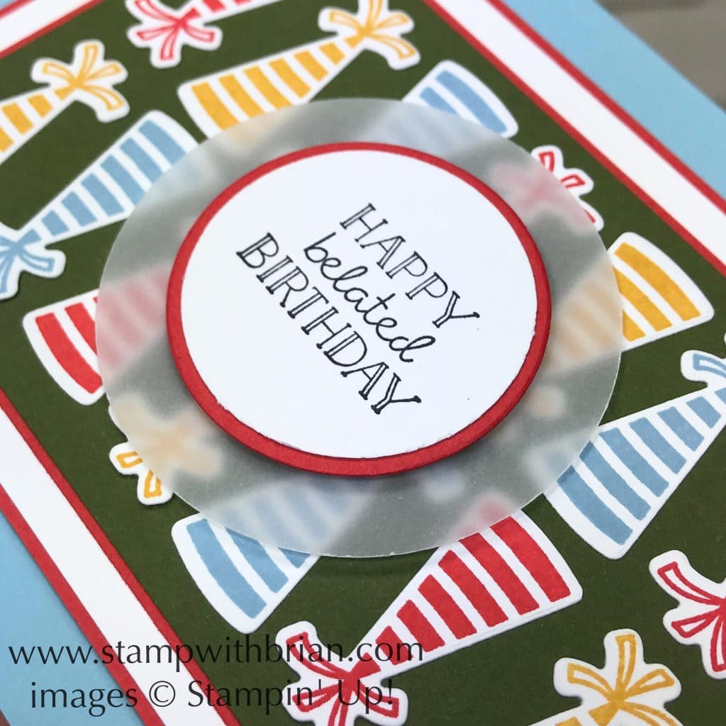 - Party Hats. The 4-1/2″ x 2-3/4″ panel on this card is covered with festive party hats. Even though I forgot your birthday, there’s still a party to be had. I alternated between three colors of hats (Balmy Blue, Poppy Parade and Crushed Curry) on a backdrop of Mossy Meadow.