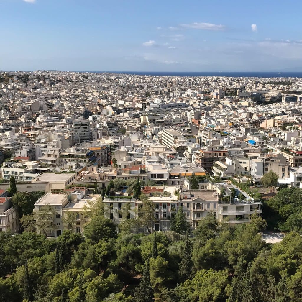 Athens, Greece almost defines the history of civilization. Landmarks, like the Parthenon at the Acropolis, date back to the 5th century BC. If you ever learned anything about Greek mythology, those stories were set here. Our guided tour drove us from the boat to the Acropolis at the center of Athens. Here’s a view of Athens, Greece from atop the Acropolis in Athens: