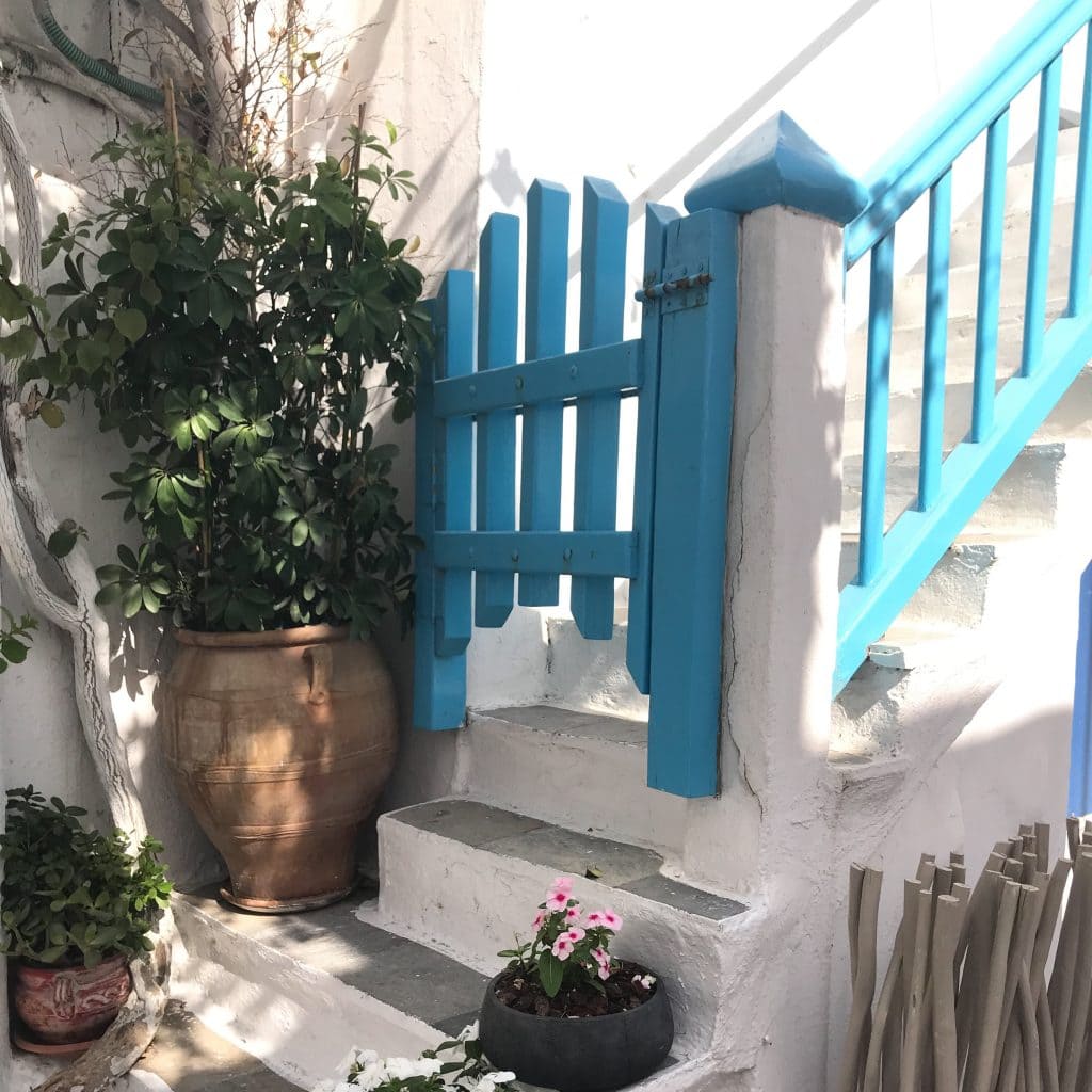 Most of the homes and shops inside the city of Mykonos are white with rounded corners. The doors, gates and banisters are painted with bright colors like reds, blues and greens. Walking through the narrow streets of Mykonos was inspiring.