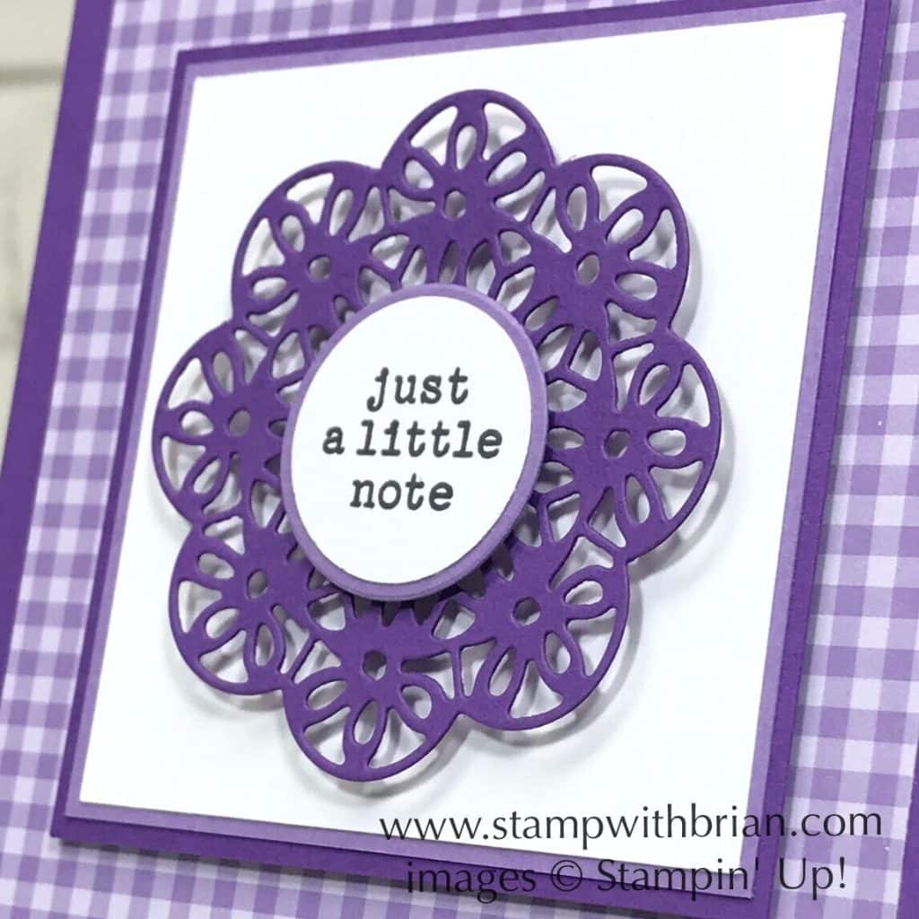 Who doesn’t love to receive a for-no-particular-reason card in the mail? “Just a little note” is the perfect Today I’m excited to share a quick-and-easy, but oh-so-sweet card that features a beautiful mix of purples (Highland Heather and Gorgeous Grape) and a combination of a fun stamp with a gorgeous die that surprised even me. Here’s my card:
