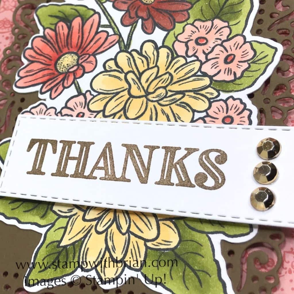 Bundles: Ornate Thanks, Ornate Style Stamp Sets: Ornate Thanks, Ornate Style Papers: Ornate Garden Designer Series Paper, Soft Suede, Terracotta Tile, Thick Whisper White Inks: Soft Suede, Tuxedo Black Memento, Stampin’ Blends (Old Olive, Calypso Coral, Cajun Craze, So Saffron, Petal Pink) Accessories: Ornate Style Dies, Stitched Rectangles Dies, Gilded Gems, Stampin’ Dimensionals