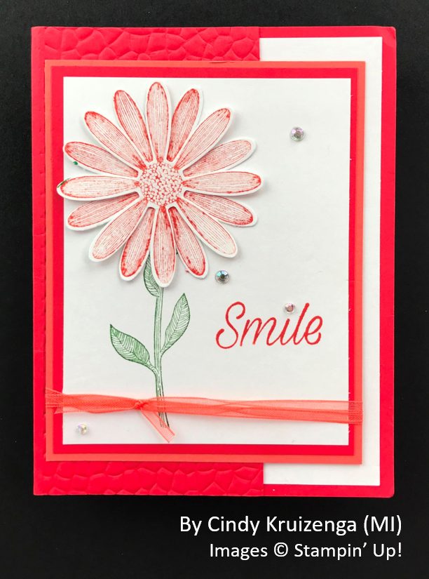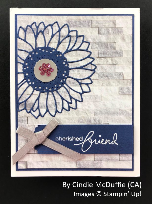 My daughter, Kate, received Brenda’s card and we both love the bright colors and pop of red! Thank you. Cindie’s card makes me wish I ordered the sunflower set……..love it in dark blue!