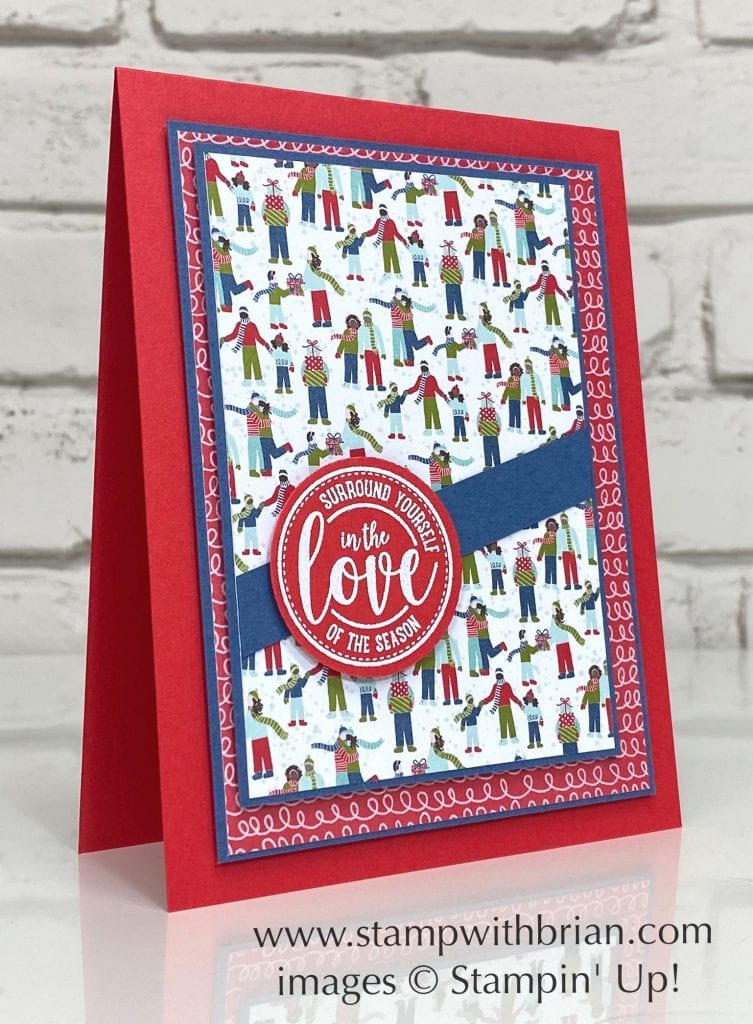 You know how much I love great sentiments, right? As soon as I saw “Surround yourself in the love of the season” from the Wrapped in Christmas stamp set, I was in love. What better way to showcase the sentiment than a background panel of people celebrating the joys of a winter day?! Here’s my card with these fun, new products that follows the sketch for the FabFriday challenge that went live on Friday: