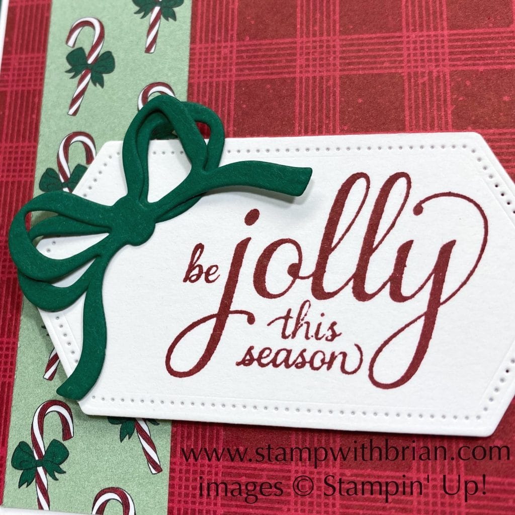 • Sweet Sentiment. I wanted something with “sweet” to coordinate with my panel of candy canes. I couldn’t find a sentiment that gave me that (and was the size I needed it to be), but…since sweet things make us happy, then a jolly sentiment would work great, too! I reached for this sentiment from Christmas Gleaming, a returning favorite in this year’s August – December 2020 Mini Catalog. While the bundle includes the stamp set, coordinating punches and coordinating papers, I only used the stamp set here. Christmas Gleaming, Tis the Season, Stampin Up!, Brian KingThe sentiment in the stamp set is actually “& be jolly this season.” I used a piece of tape to cover up the “&” before I stamped this sentiment on Thick Whisper White. I cropped the sentiment with a Stitched Nested Labels Die. So sweet.