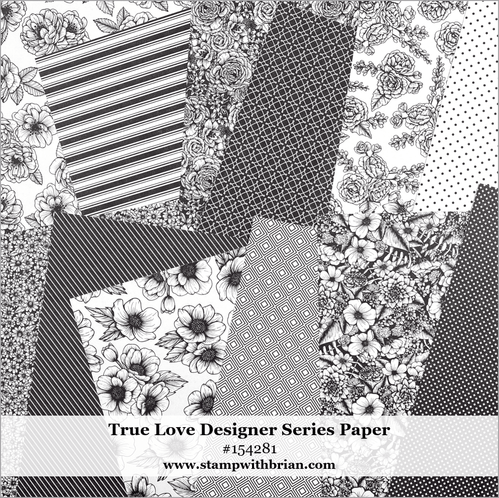 I love, love, love black-and-white Designer Series Papers. I love that I can add a touch of color to the pages and dress them up in fun ways, but I didn’t do a think with this paper (other than cut it and layer it on my card). It’s THAT gorgeous. Here’s a closer look at the pages in the True Love Designer Series Paper: