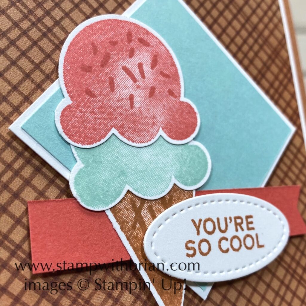 There are some surprising colors in the Ice Cream Corner Designer Series Paper – I would have never expected to see Terracotta Tile represented as an ice cream color, but I love it so very much. I would never have imagined the color combination on my card without it, either. If you like this mix of Pool Party, Cinnamon Cider and Terracotta Tile as much as I do, I hope you will save this for future reference: