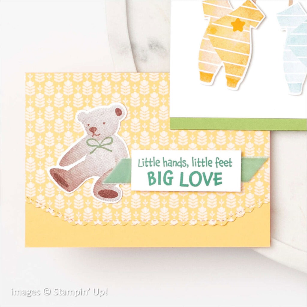 Basic Borders Dies, Stampin Up!, 155558 This sample, found on page 59 of Stampin’ Up!’s 2021 Annual Catalog, features on of the Basic Borders Dies and the All for Baby Bundle: