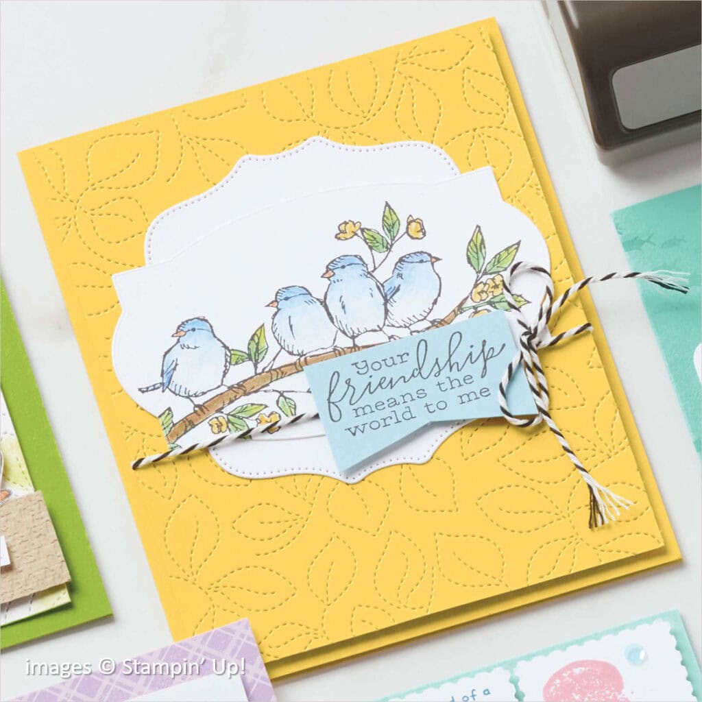 Stitched Greenery Die, Stampin Up! 155451 Just look at the beautiful texture this die gives this sample with the Free as a Bird stamp set on page 82 of Stampin’ Up!’s 2021 Annual Catalog: