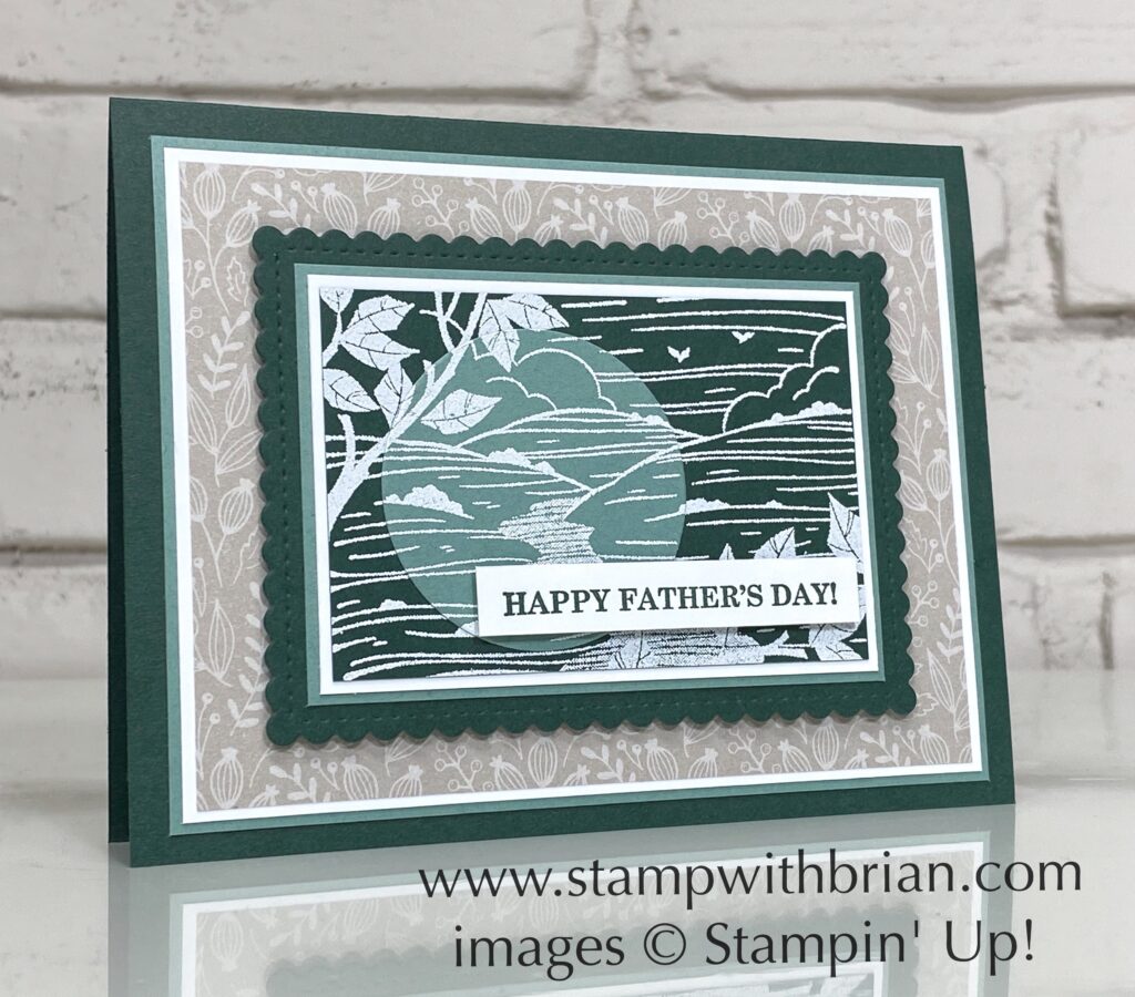 • Better Places and Best Year. To build my peaceful scene on this card, I stamped the beautiful landscape with Versamark ink on Evening Evergreen and Soft Succulent and then covered both panels with White Stampin’ Emboss Powder. When I heated the powder with my Heat Tool, the entire scene began to shine. This host set is available for $12 with Stampin’ Rewards (when you spend $150+, you earn Stampin’ Rewards that can be spent on any product or on exclusive, price-reduced host products. Here’s a look at the Better Places Host Set:Better Places host set, Stampin Up!, 155858While there’s a “Happy Father’s Day” sentiment in the stamp set, I pulled my “Happy Father’s Day” from Best Year, a stamp set that carried over from Stampin’ Up!’s 2020 Annual Catalog into its 2021 Annual Catalog because it fit the layout I wanted on this card (a long, slender sentiment vs. a chunky one). Here’s a look at the year-long celebrations in the Best Year stamp set: Best Year, Stampin Up! 152568