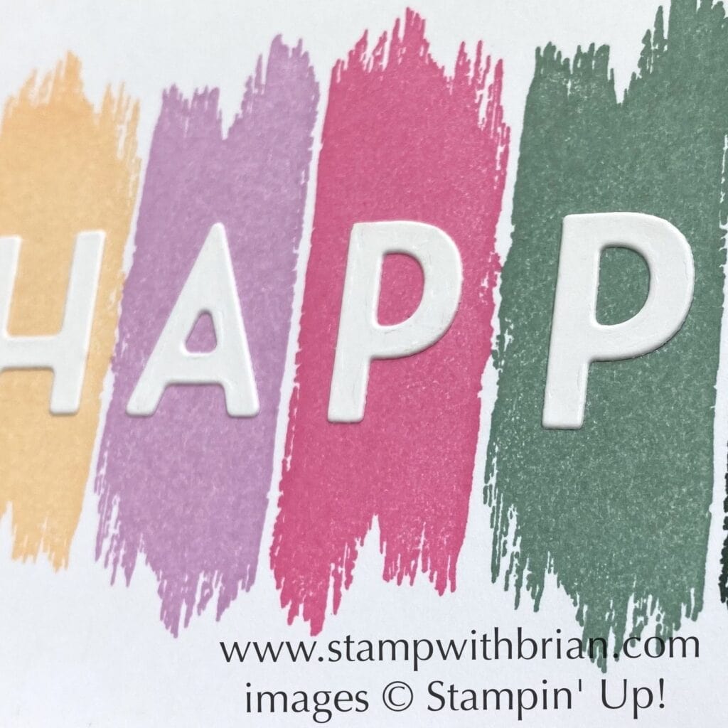 This fun bundle is not in Stampin’ Up!’s 2021 Annual Catalog, so it’s only available through June 30 while supplies last. - Playful Alphabet and Painted Texture. After I stamped the paint splashes with the new In Colors, I cropped the letters for “HAPPY” from Thick Basic White with the Playful Alphabet Dies. Such fun! They were easy to line up inside the paint splotches. It might look as though they are stenciled into the paint or cut from the panel of paper, but they are simply added on. Here’s a closer look: