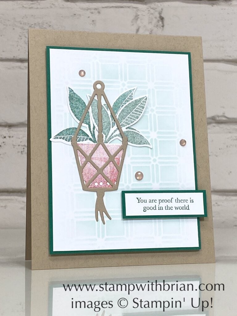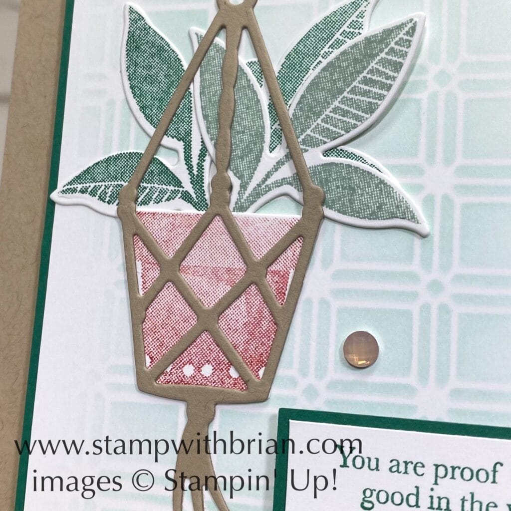 The potted plant that’s a focal point on my card includes three images that are stamped with the Plentiful Plants stamp set and cropped with the Perfect Plants Dies. I used Shaded Spruce and Soft Succulent to stamp the plants and Cajun Craze to stamp the pot. The potted plant hangs with a die from Perfect Plants – so easy and fun to build! Here’s a closer look at my hanging plant: