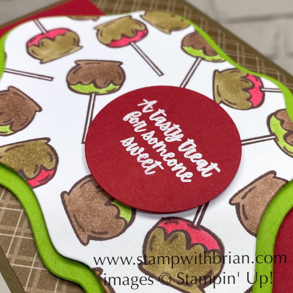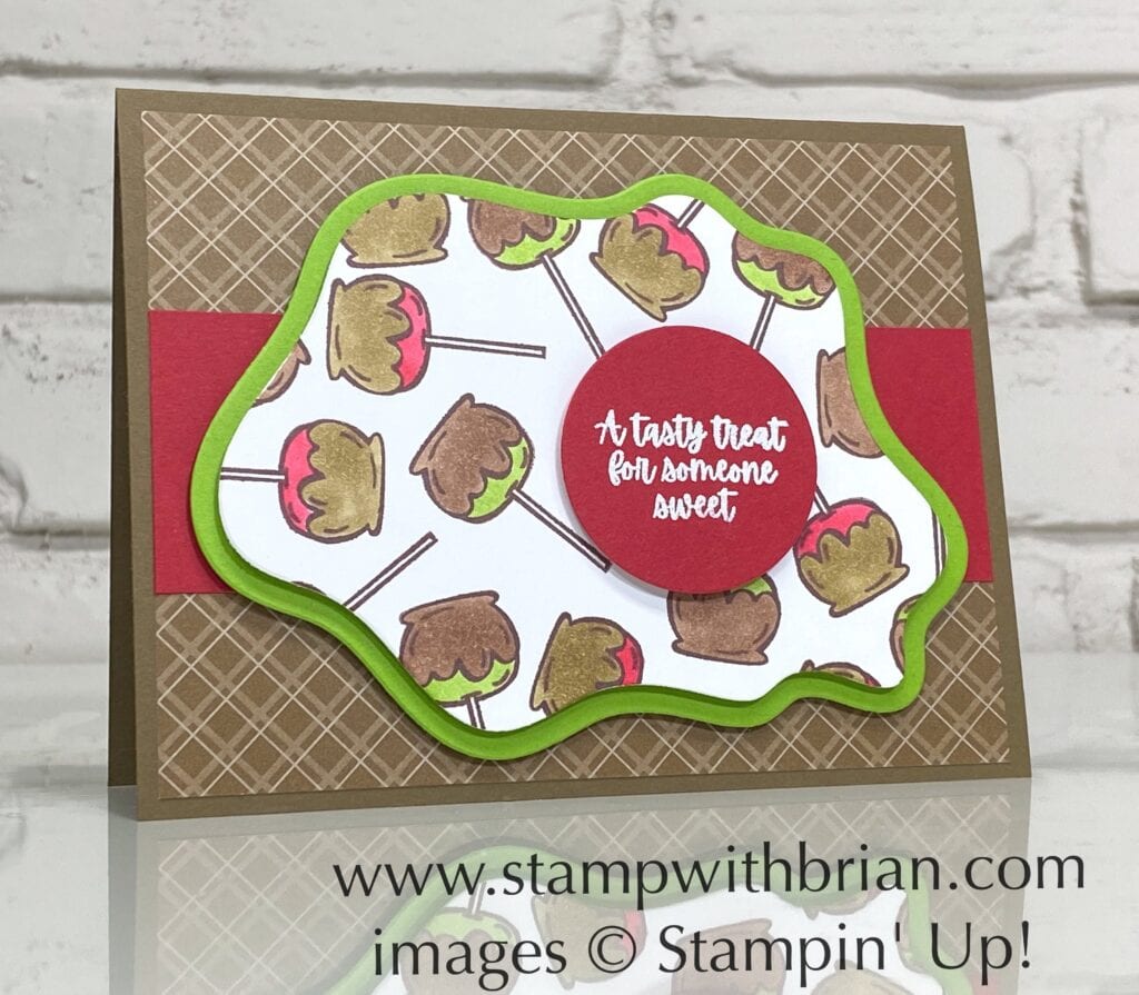 Not only does my apple-filled card feature a mix of Granny Smith Apples and Gala Apples, but some are caramel-coated and others are chocolate-dipped. Such a sweet variety of bright and brown tones. Here’s a look at the Sweets & Treats stamp set I used to build my background and to stamp my sentiment on my card: