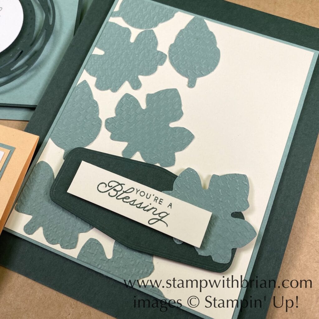 The kit includes a mix of Soft Succulent leaves that can be attached to each treat box. Since I mostly used my kit components to make card, I ran the leaves through my Stampin’ Cut & Emboss Machine with the Tasteful Textile 3D Embossing Folder to give them a beautiful texture. I glued them along the left side of a Very Vanilla card panel and added a sentiment (from the stamp set in the kit). The sentiment is framed with a leaf and a cutout of Evening Evergreen with one of the dies in the Tasteful Labels Dies.