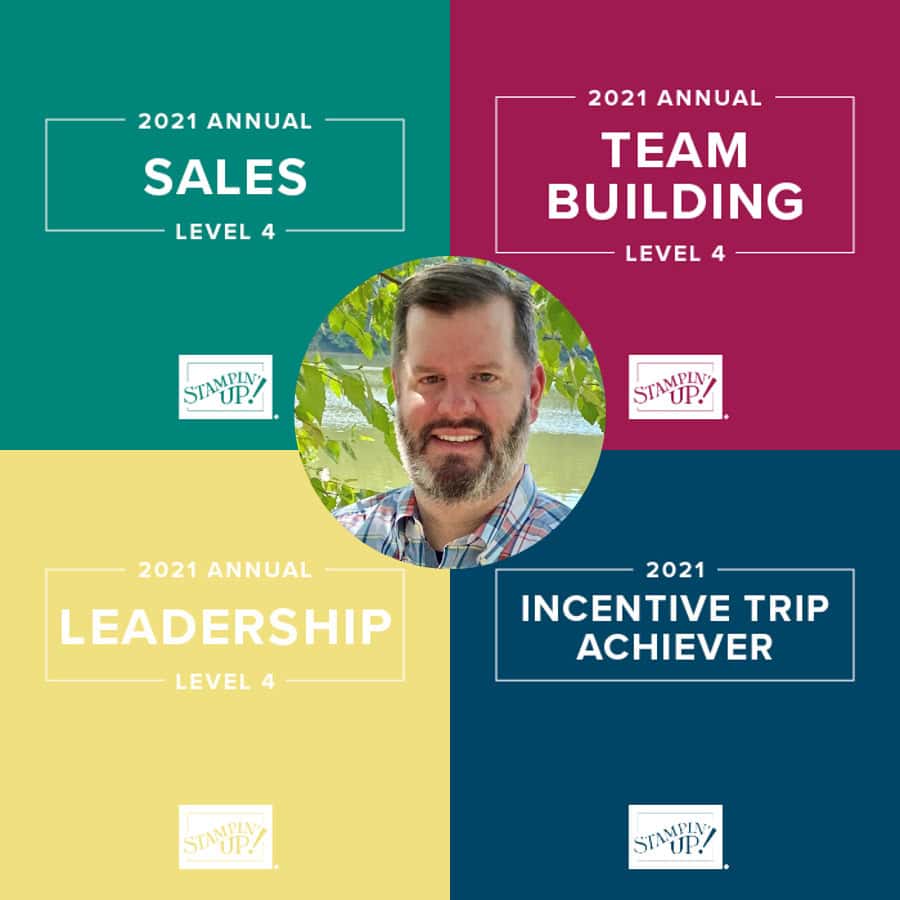 Stampin’ Up! ranks demonstrators from 1 to 4 in three principal areas – Sales (customer purchases), Team Building (team additions during the period) and Leadership (team promotions and achievements during the period. I ranked Level 4 in all three areas: