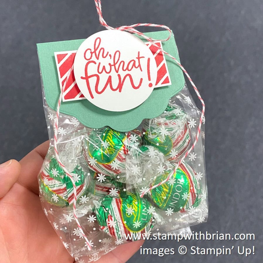 Who doesn’t love peppermint white chocolate truffles? I filled one of the nine gusseted, snowflake bags in this kit with Lindt Lindor Truffles and capped the bag with a simple bag topper. Here’s a look: