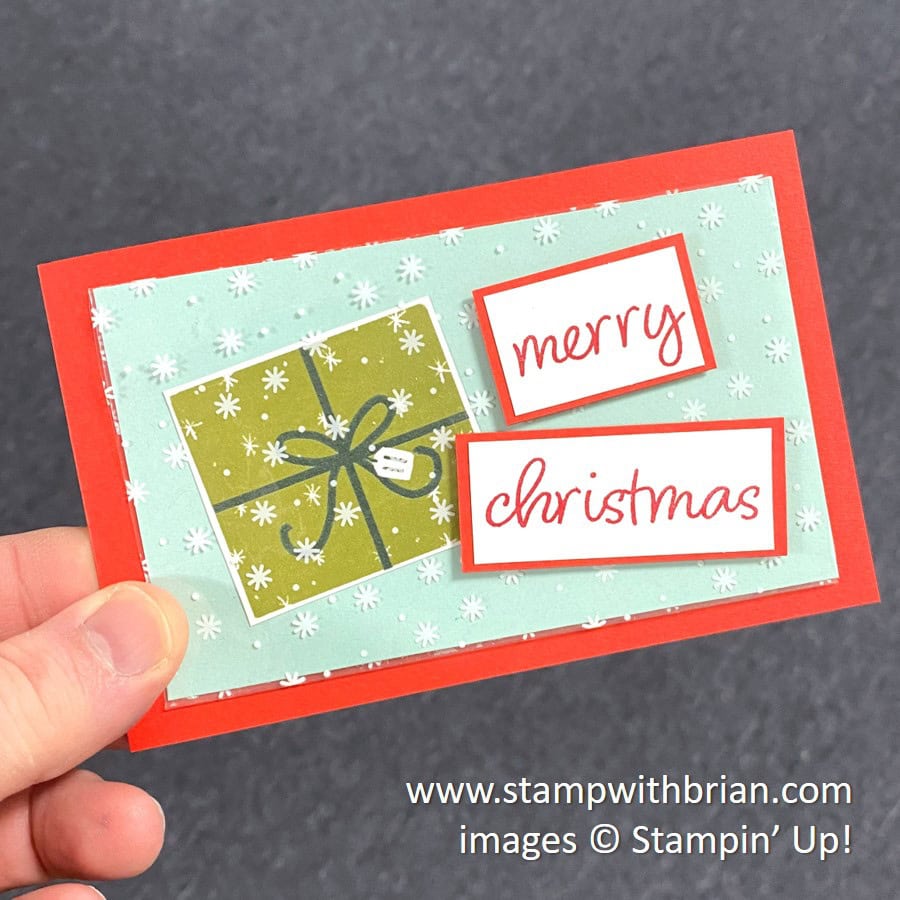 I used a gift bag for the next two projects, too. I followed the alternative projects suggested by Stampin’ Up! to add a gift card holder to the large stack of presents by snipping 3″ from the bottom of the gusseted bag and attaching it to the presents with the tear-and-tape that was provided in the kit. Such a clever way to give a special gift: