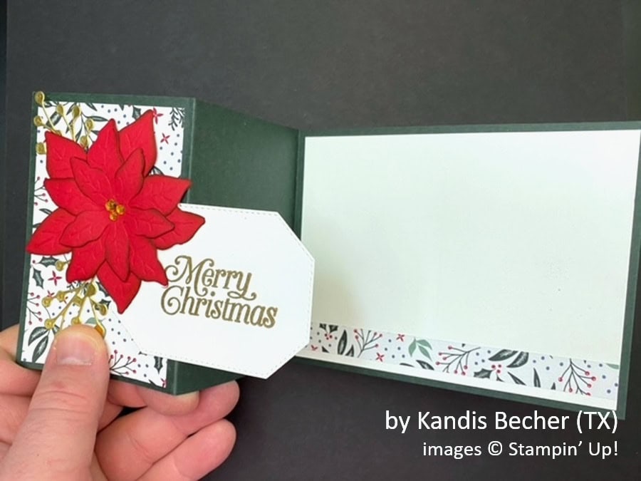 Another day of beautiful, creative cards. I am fortunate enough to receive the beautiful Z fun-fold card by Kandis Becher. I love the pretty poinsettia, gold sprigs, and the gold heat embossed sentiment. The DSP is one of my favorites this year. Thanks, Brian, for hosting this swap.
