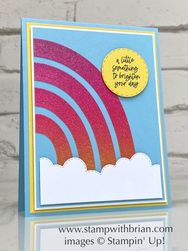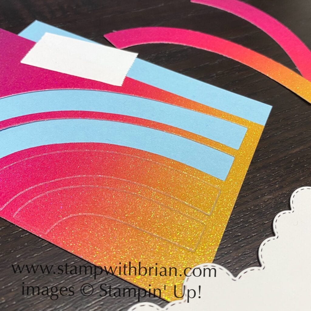 You might be scratching your head or wiping your screen – yes, I used Glimmer Paper to build the arches in my rainbow. The Rainbow Glimmer Paper (from Stampin’ Up!’s 2021 Annual Catalog) gave me the beautiful blend of color from Magenta Madness to Mango Melody – and there are so many other colors featured in the Glimmer Paper. AND it doesn’t shed like the old Glimmer Papers used to shed. Five stars. An enjoyable experience. ♥