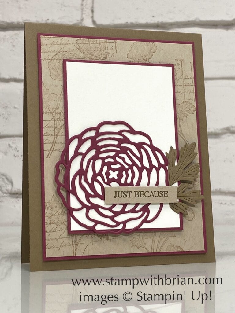 There are several elements of the simple card I’m sharing today that might leave you scratching your head a bit. For starters, the warm, rich colors might not be what you’re used to seeing as Spring begins to approach. While my card is simple in design, there are still some rustic and vintage elements you don’t usually see from me. Here’s my “just because” card with the Ranuculus Romance Bundle: