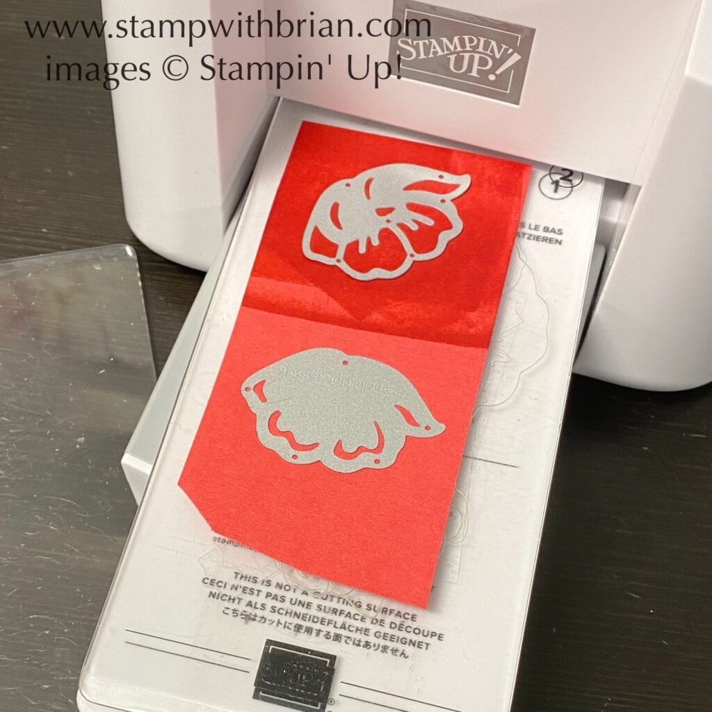 To build my flowers and leaves, I ran my ink pads over the coordinating cardstock to achieve a richer concentration of color. I cropped the detailed images with the inked cardstock and the base images with the cardstock. This really adds something special to these beautiful flowers. Here’s a look at the Sweet Sorbet flower as it’s above to pass through my Mini Stampin’ Cut & Emboss Machine: