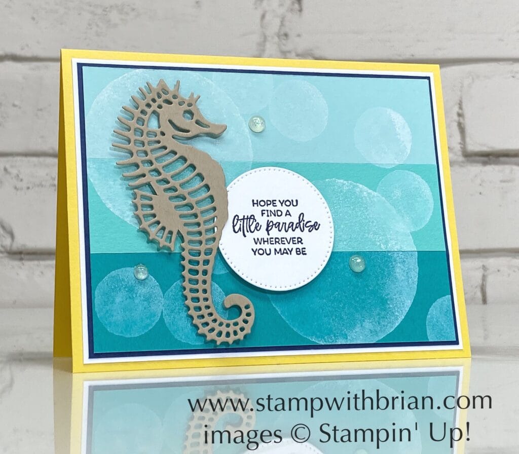 The regal sea horse on this card is cropped with the Sea Life Dies, part of the Seascape Bundle, which will soon be retiring from Stampin’ Up!’s 2021 Annual Catalog (the bundle will be gone on May 2 or as soon as supplies run out):