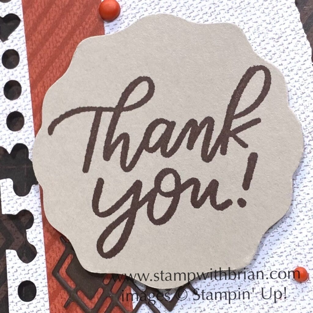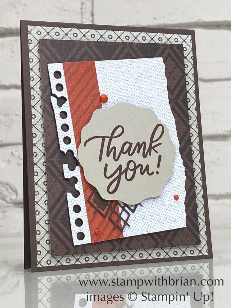 I’ve made a simple, but layered, card to share with you today. With neutral tones and fun patterns, this is a perfect thank you card for the man in your life. The simple layout, though, can be used to build a card for anyone. Not every man would love to receive this card (I like brighter, bolder colors), and not every woman would be upset to receive it (neutrals are for everyone). Still I used for patterns from the He’s the Man Specialty Designer Series Paper to build it and a die from the coordinating set. Here’s my card: