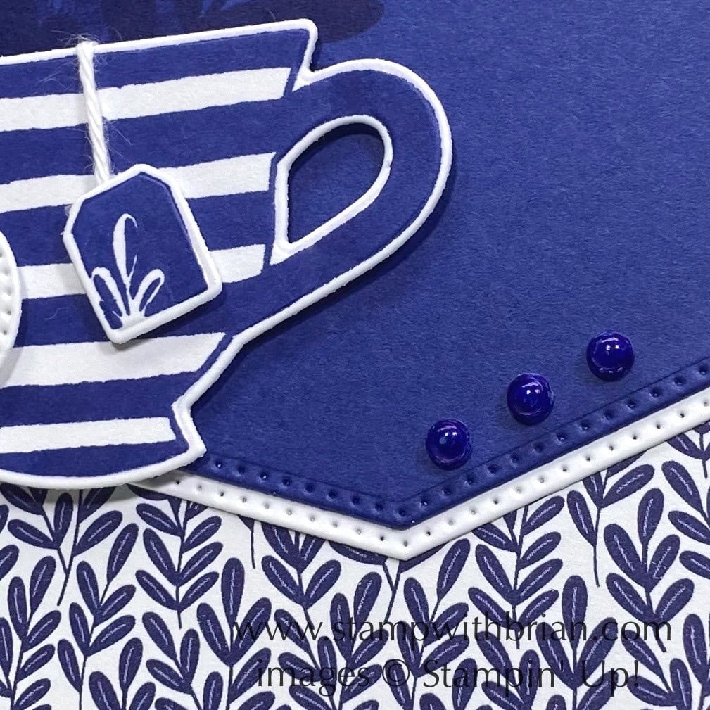 Bundles: Cup of Tea Stamp Sets: Cup of Tea Papers: Butterfly Kisses 6″ x 6″ Designer Series Paper, Starry Sky, Thick Basic White Inks: Starry Sky, Stampin’ Blends (Starry Sky) Accessories: Teacup Dies, Basic Borders Dies, Stylish Shapes Dies, Iridescent Pearl Basic Jewels, White Baker’s Twine, Mini Stampin’ Dimensionals, Stampin’ Dimensionals