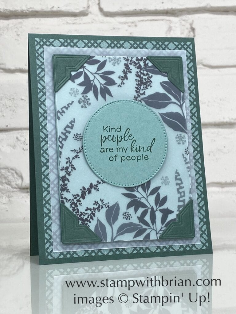 Simply Succulents, Lovely Layers Vellum, Stampin Up!, Brian King, thank you cardI stamped the sentiment with Evening Evergreen on Soft Succulent cardstock and cropped it with a Stylish Shapes circle die. The soft green pulls from the Designer Series Paper layer near the base of my card and helps to highlight the Soft Succulent panel that’s behind the Lovely Layers Vellum piece. On this card, though, the Soft Succulent circle seemed to blend too much with the panel below it. This sentiment didn’t stand out enough for me.