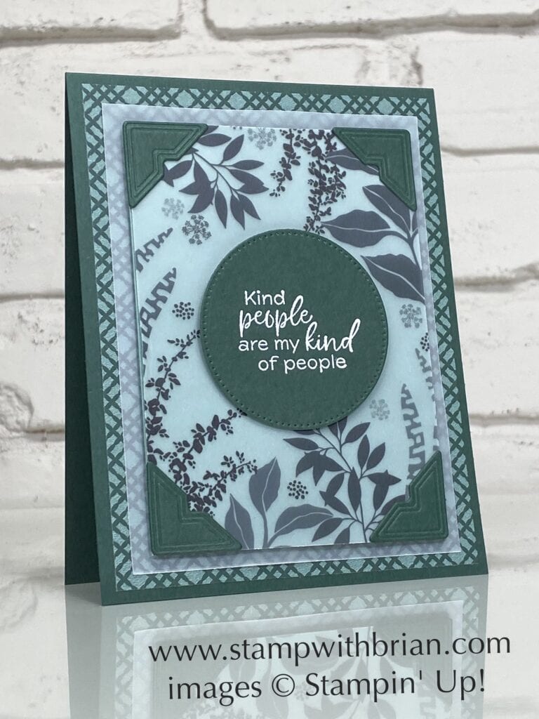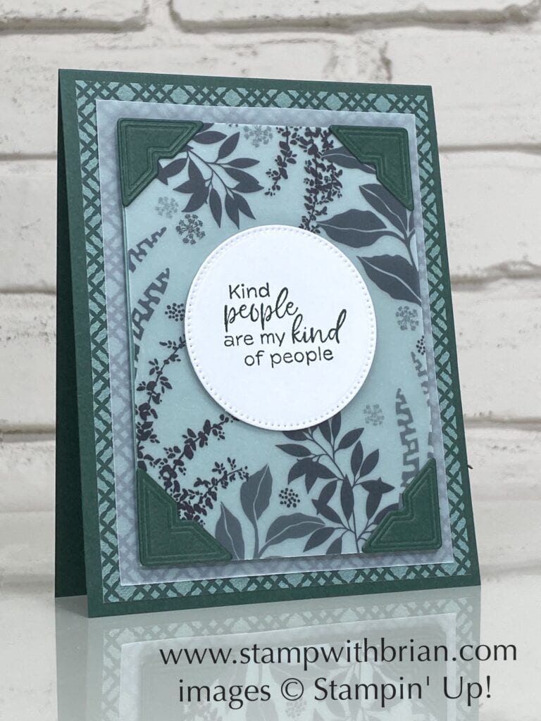 Simply Succulents, Lovely Layers Vellum, Stampin Up!, Brian King, thank you cardWhen I heat-embossed the sentiment with White Stampin’ Emboss Powder on Evening Evergreen, the sentiment really popped for me. I didn’t initially envision the dark circle at the center of my card, but it seemed to be the option I liked the most.
