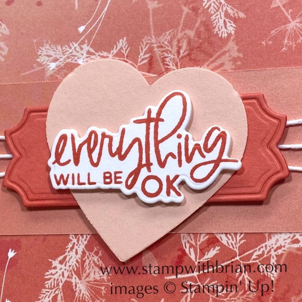 I layered my sentiment (stamped with Calypso Coral ink on Thick Basic White) on a Petal Pink heart (cropped with the Heart Punch Pack) and then on a label cropped from Calypso Coral with the Natural Prints Dies. This is such a beautiful label! I ran a piece of white baker’s twine around the front panel behind the sentiment and tied them in the middle to angle the twine in a fun way. Here’s a closer look: